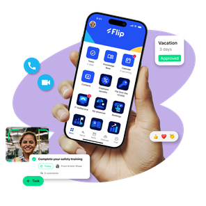 Flip's mobile app combines messaging, chat, HR tools, and your knowledge base in one secure application. No additional tools or licences required.